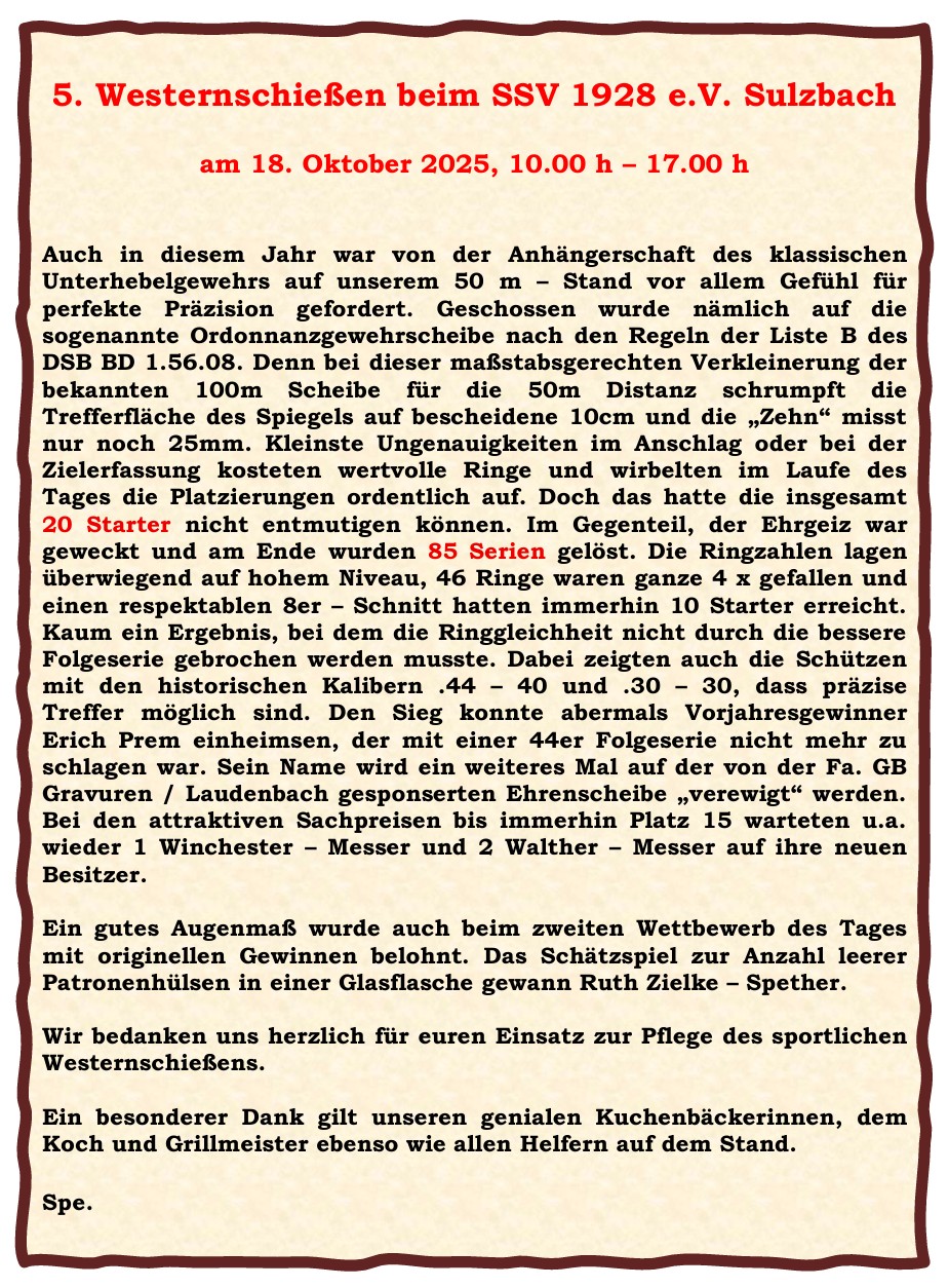 Leider hat die Corona - Pandemie auch viele Schießsportveranstaltungen in der Region zum Erliegen gebracht. Das traf auch die Freunde des Westernschießens.Wir hatten uns daher entschlossen, ein kleines, aber eigenes Schießen mit nostalgischen Westerngewehren ins Leben zu rufen, natürlich entsprechend den gültigen Coronavorschriften mit Abstands -...